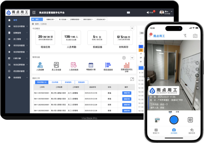 雨点用工是一款面向蓝领项目现场管理过程中的蓝领工人使用的手机app移 动应用,主要包括水印相机、签到打卡和我的任务等模块功能,实现对蓝 领工人上班时间内的工作内容和工作状态的全程管理。